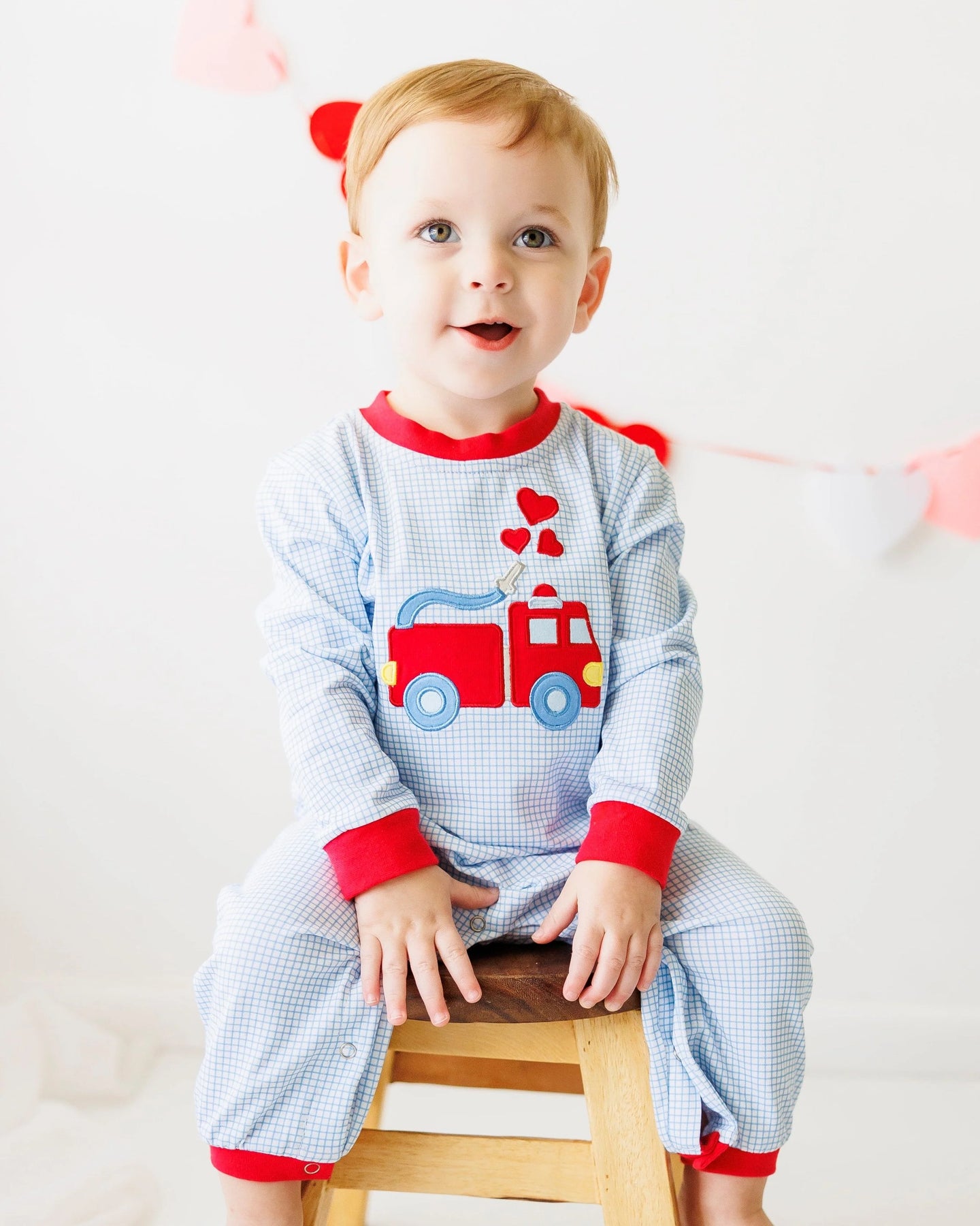We are smitten with this applique firetruck knit romper, perfect for February 14th.